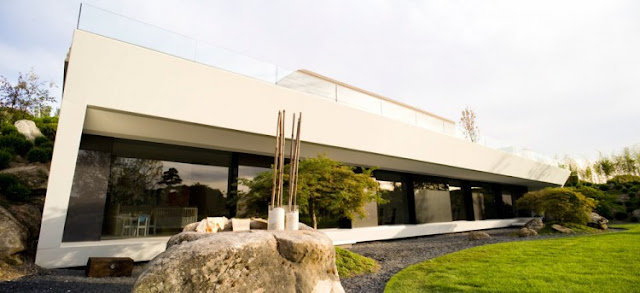 The beautiful residence is located in Somosaguas, a residential area in Pozuelo de Alarcón, Spain and boasts 18,300 square feet of living spaces. Its architecture is characterized by sculptural volumes and is dominated by horizontal lines. The volumes are superimposed in layers and they seem to naturally “grow” from the ground. The main purpose when building this home was to create a modern residence with “risky stylized forms” without compromising convenience and comfort.