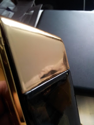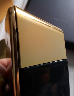 looks like a lighter shade of pure gold. Also the finish on the fake isn't as smooth as the gen.